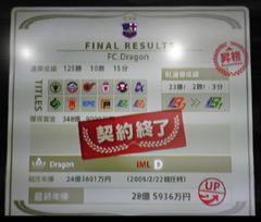 ちなみに契約終了画面で確認すると・・・監督カード1枚で約4億ちょっと監督年俸アップ!!うんうん頑張った・・・。ですがIMLDからCへあげることは無理ぽい・・・。多分次の監督カード使いきれば上がるかなあ~というレベルですので次回も頑張りたいと思います。